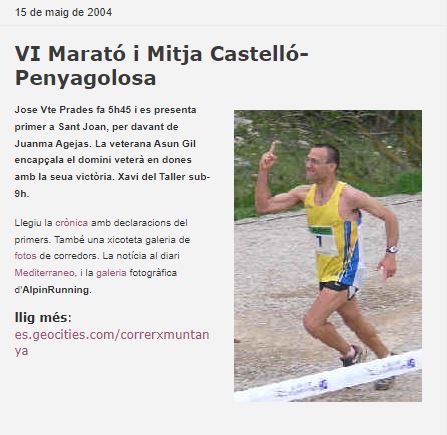 La sisena edició de la Marató i mitja Castelló-Penyagolosa 2004 va tindre com a guanyador a Jose Vicente Prades (5:45:29), compartint el podi amb dos corredors de molt nivell com el madrileny Juanma Agejas i el lleonés Salva Calvo. Prades repetiria triomf cinc anys més tard. La corredora Asunción Gil (7:29:52) guanyava en xiques seguida de Rosi Cantos i Yolanda Rodríguez.