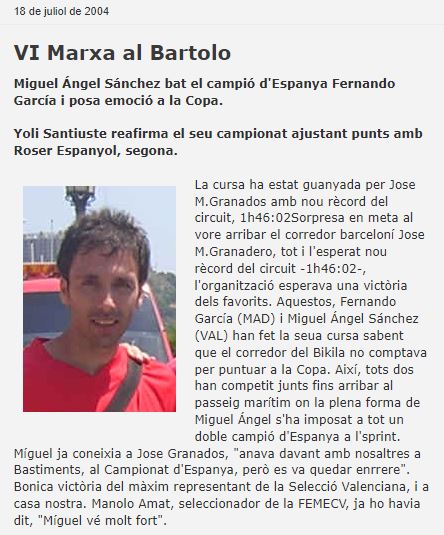 La cursa ha estat guanyada per Jose M.Granados amb nou rècord del circuit, 1h46:02Sorpresa en meta al vore arribar el corredor barceloní Jose M.Granadero, tot i l’esperat nou rècord del circuit -1h46:02-, l’organització esperava una victòria dels favorits. Aquestos, Fernando García (MAD) i Miguel Ángel Sánchez (VAL) han fet la seua cursa sabent que el corredor del Bikila no comptava per puntuar a la Copa. Així, tots dos han competit junts fins arribar al passeig marítim on la plena forma de Miguel Ángel s’ha imposat a tot un doble campió d’Espanya a l’sprint. Míguel ja coneixia a Jose Granados, “anava davant amb nosaltres a Bastiments, al Campionat d’Espanya, però es va quedar enrrere”. Bonica victòria del màxim representant de la Selecció Valenciana, i a casa nostra. Manolo Amat, seleccionador de la FEMECV, ja ho havia dit, “Míguel vé molt fort”.
