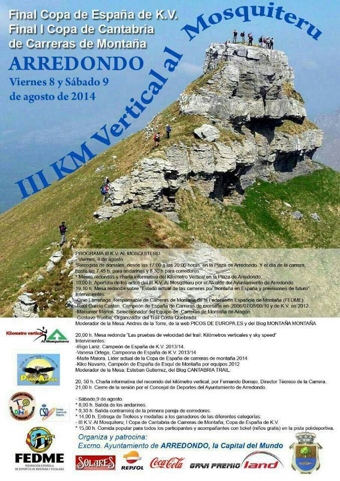 El passat diumenge 21 de maig es va disputar a la localitat càntabra d’Arredondo el Campionat d’Espanya de Carrera Vertical, la màxima competició de la temporada d’aquesta especialitat. La sisena edició del KV Arredondo, amb meta al mateix cim del Mosquiteru, oferia enguany un nou recorregut per altre vessant més costerut i on les marques s’han rebaixat considerablement.